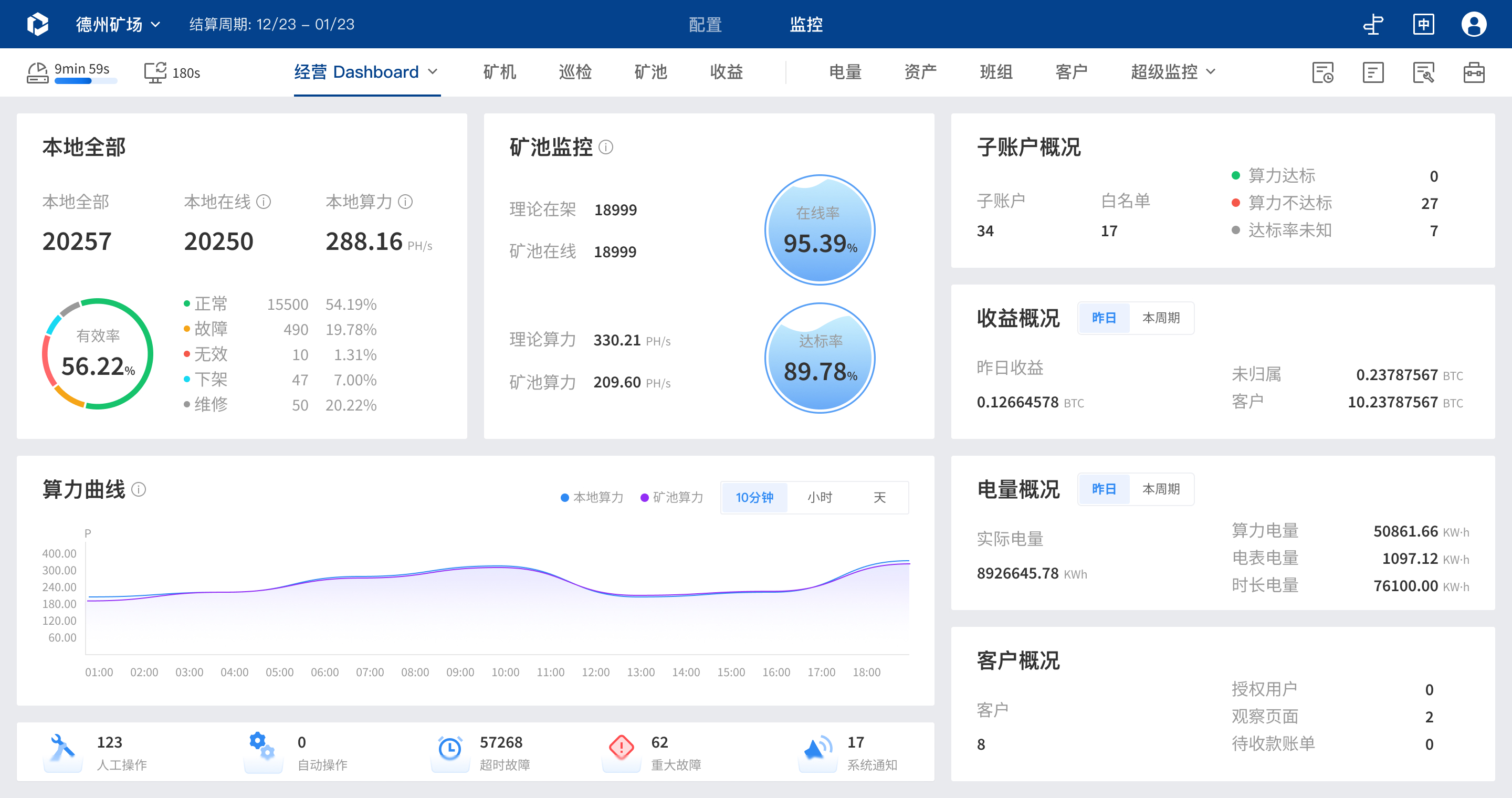 通过统计分析矿场各维度的数据,并将数据以丰富的数据图表可视化展示,实现轻松掌握矿场数据并指导矿场运维策略